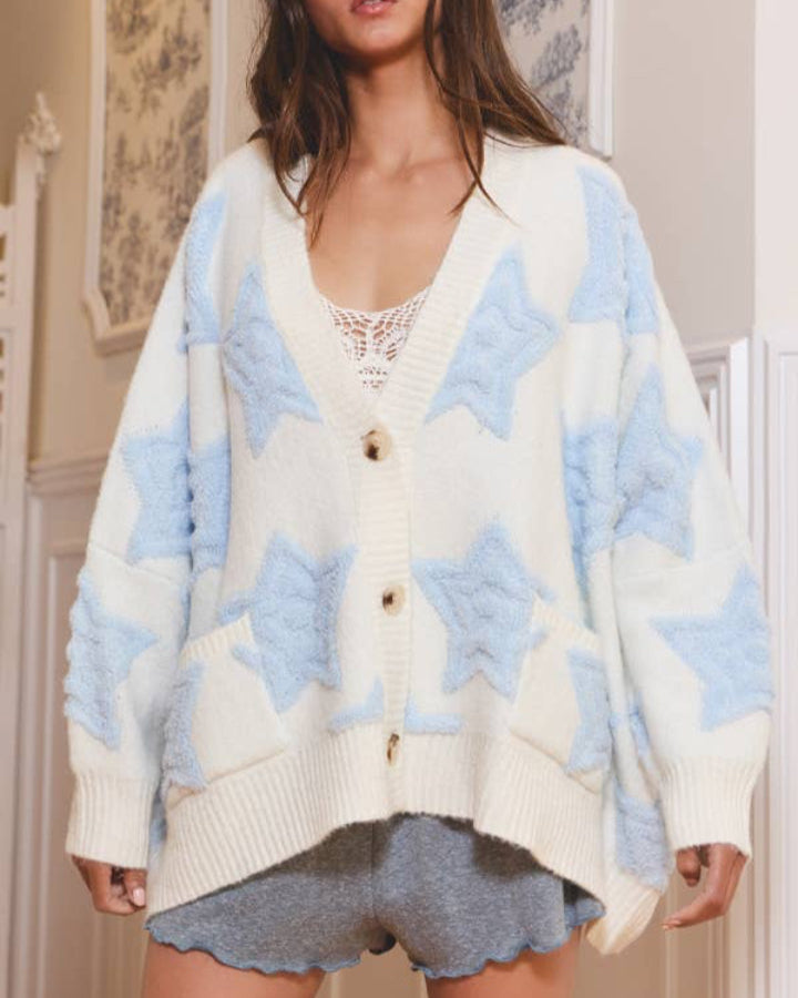 Oversized Star Pullover Sweater Cardigan - Long drop-shoulder sleeves - Open front and button down - Oversize fit